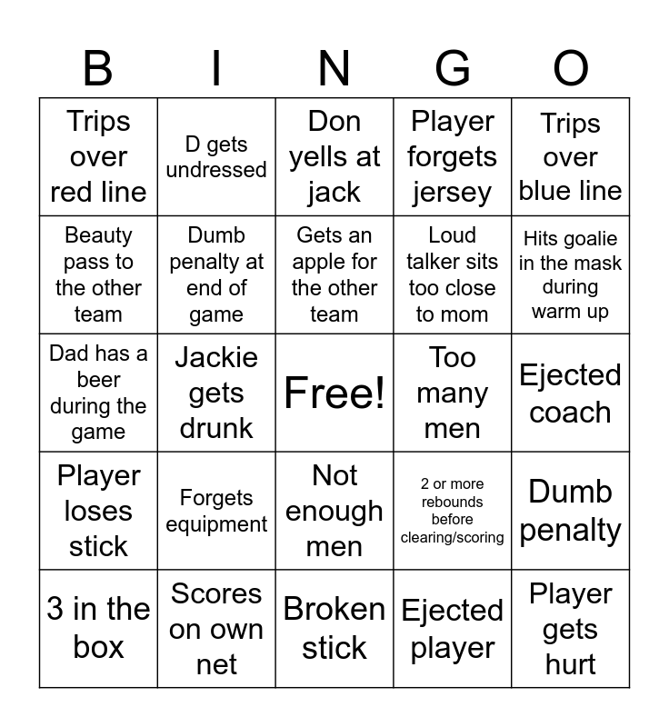 This bingo card has a free space and 24 words: Forgets equipment, Scores on own net, Gets an apple for the other team, 3 in the box, Trips over blue line, Trips over red line, Beauty pass to the other team, D gets undressed, Too many men, Not enough men, Loud talker sits too close to mom, Dad has a beer during the game, 2 or more rebounds before clearing/scoring, Dumb penalty, Dumb penalty at end of game, Ejected player, Ejected coach, Don yells at jack, Hits goalie in the mask during warm up, Jackie gets drunk, Player gets hurt, Player loses stick, Player forgets jersey and Broken stick.