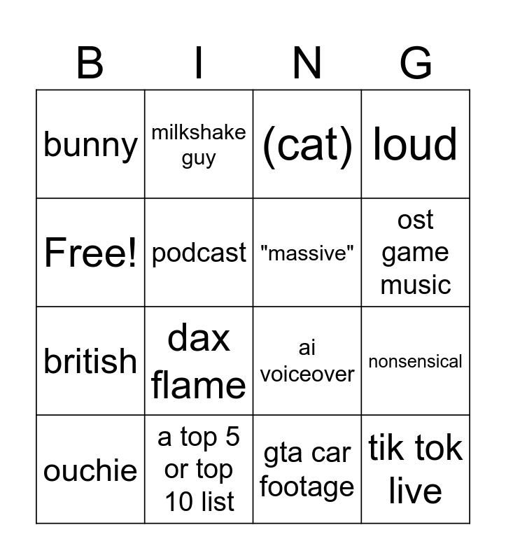 This bingo card has 45 words: guy screaming, ouchie, food, odl (old), local, funny animals, (cat), scizo, Free!, boom boom boom boom boom, loud, a top 5 or top 10 list, basketball, school, bladee/hyperpop, celebrity, micah, ai voiceover, ai video, dax flame, milkshake guy, video game, animation, bunny, impractical, gta car footage, subtitles, stolen content, gambling, tik tok live, drug, good mythical morning, unique content, arguing, wizzie or wizard things, nonsensical, hopecore, joshua block, store/ shopping place, ost game music, podcast, british, next to no likes on video, "massive" and brainrot.