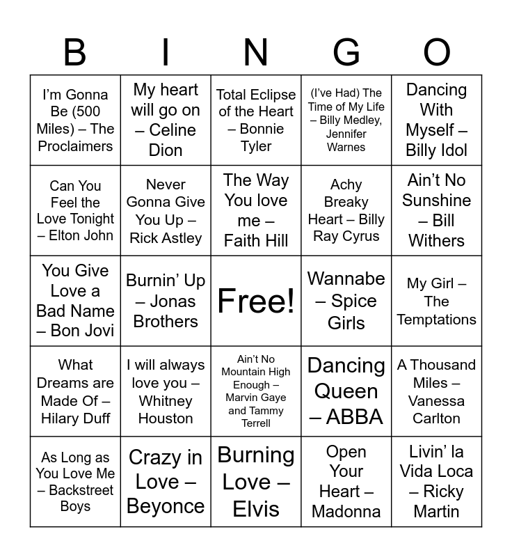 This bingo card has a free space and 35 words: Hero- Enrique Iglesias, Can’t Take My Eyes Off Of You – Frankie Valli and the Four Seasons, Time After Time – Cindi Lauper, Never Gonna Give You Up – Rick Astley, Ain’t No Mountain High Enough – Marvin Gaye and Tammy Terrell, (I’ve Had) The Time of My Life – Billy Medley, Jennifer Warnes, Can You Feel the Love Tonight – Elton John, All you need is love – Beatles, The Way You love me – Faith Hill, Single Ladies – Beyonce, You Give Love a Bad Name – Bon Jovi, Dancing With Myself – Billy Idol, No Scrubs – TLC, That Don’t Impress Me Much – Shania Twain, I’m Gonna Be (500 Miles) – The Proclaimers, Wannabe – Spice Girls, Open Your Heart – Madonna, Burnin’ Up – Jonas Brothers, What Dreams are Made Of – Hilary Duff, Livin’ la Vida Loca – Ricky Martin, Dancing Queen – ABBA, As Long as You Love Me – Backstreet Boys, A Thousand Miles – Vanessa Carlton, Crazy in Love – Beyonce, Total Eclipse of the Heart – Bonnie Tyler, Ain’t No Sunshine – Bill Withers, ABC – Jackson 5, I want to hold your hand – Beatles, Achy Breaky Heart – Billy Ray Cyrus, My Girl – The Temptations, Love Story – Taylor Swift, Burning Love – Elvis, I will always love you – Whitney Houston, My heart will go on – Celine Dion and Signed, sealed, delivered – Stevie Wonder.