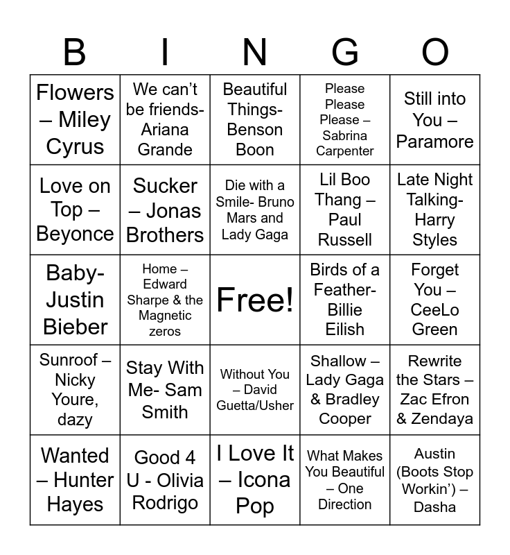 This bingo card has a free space and 33 words: Just the way you are – Bruno Mars, Grenade- Bruno Mars, Home – Edward Sharpe & the Magnetic zeros, Perfect – Ed Sheeran, Sunroof – Nicky Youre, dazy, Sucker – Jonas Brothers, Still into You – Paramore, Wanted – Hunter Hayes, We can’t be friends- Ariana Grande, Stay- Rihanna, Die with a Smile- Bruno Mars and Lady Gaga, Beautiful Things- Benson Boon, Until I Found You- Stephen Sanchez, Good Luck Babe- Chapell Roan, Birds of a Feather- Billie Eilish, Late Night Talking- Harry Styles, Good 4 U - Olivia Rodrigo, Baby- Justin Bieber, Stay With Me- Sam Smith, Shallow – Lady Gaga & Bradley Cooper, Without You – David Guetta/Usher, I Knew You Were Trouble – T swift, Flowers – Miley Cyrus, Forget You – CeeLo Green, I Love It – Icona Pop, Austin (Boots Stop Workin’) – Dasha, Please Please Please – Sabrina Carpenter, Lil Boo Thang – Paul Russell, Love on Top – Beyonce, Rewrite the Stars – Zac Efron & Zendaya, Shut Up and Dance – WALK THE MOON, What Makes You Beautiful – One Direction and I’m Yours – Jason Mraz.