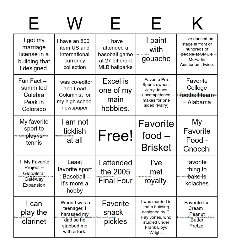This bingo card has 14 images, a free space and 24 words: Least favorite sport : Baseball – it's more a hobby, When I was a teenager, I harassed my dad so he stabbed me with a fork., Excel is one of my main hobbies., I can play the clarinet, 1. I’ve danced on stage in front of hundreds of people at SMU’s McFarlin Auditorium, twice., I got my marriage license in a building that I designed., Fun Fact – I summited Culebra Peak in Colorado, I have an 800+ item US and international currency collection, Favorite food – Brisket, I attended the 2005 Final Four, Favorite Pro Sports owner : Jerry Jones (incompetence makes for one sided rivalry), My favorite sport to play is tennis, I’ve met royalty., favorite thing to bake is kolaches, I was co-editor and Lead Columnist for my high school newspaper, I was married in the a building designed by E. Fay Jones, who studied under Frank Lloyd Wright., My Favorite Food - Gnocchi, I have attended a baseball game at 27 different MLB ballparks, Favorite College football team – Alabama, I am not ticklish at all, Favorite Ice Cream : Peanut Butter Pretzel, 1. My Favorite Project – Globalstar Gateway Expansion, I paint with gouache and Favorite snack - pickles.