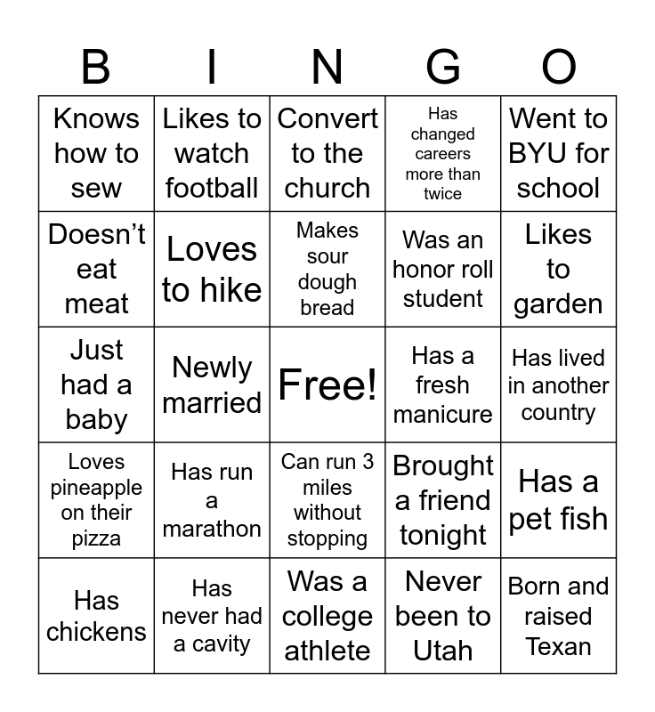 This bingo card has a free space and 45 words: Has more than 2 cats, Born and raised Texan, Can ride a horse, Has chickens, Plays the guitar, Never been to Utah, Convert to the church, Born less than 20 miles from here, Went to BYU for school, Has never had a cavity, Has changed careers more than twice, Has a fresh manicure, Can run 3 miles without stopping, Has run a marathon, Was a high school cheerleader, Was a college athlete, Is a “Swifty”, Just had a baby, Plays dungeon and dragons, Likes to garden, Likes to watch football, Loves to mountain bike, Knows how to knit, Knows how to sew, Can speak more than 2 languages, Has lived in another country, Been in the ward for less than 6 months, Has been to Disneyland, Brought a friend tonight, Loves pineapple on their pizza, Doesn’t have any pets, Has a pet fish, Exercises regularly, Has a chronic illness, Lives in the same house for 10+years, Newly married, Sent a child on a mission, Has family in Denton, Loves to cook, Makes sour dough bread, Doesn’t eat meat, Was an honor roll student, Knows how to do a gymnastics flip, Loves to hike and Doesn’t like chocolate.