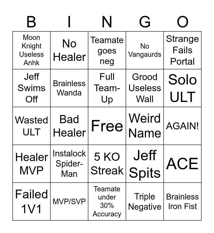 This bingo card has a free space and 24 words: Instalock Spider-Man, MVP/SVP, Full Team-Up, Failed 1V1, Strange Fails Portal, Moon Knight Useless Anhk, Jeff Swims Off, No Healer, Weird Name, 5 KO Streak, Grood Useless Wall, Wasted ULT, Jeff Spits, ACE, Brainless Wanda, Triple Negative, AGAIN!, Teamate goes neg, Solo ULT, Bad Healer, Brainless Iron Fist, Healer MVP, No Vangaurds and Teamate under 30% Accuracy.