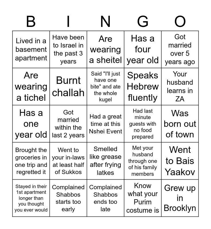This bingo card has a free space and 28 words: Went to Bais Yaakov, Gave Tzedaka Today, Speaks Hebrew fluently, Know what your Purim costume is, Are wearing a tichel, Are wearing a sheitel, Have been to Israel in the past 3 years, Brought the groceries in one trip and regretted it, Had last minute guests with no food prepared, Stayed in their 1st apartment longer than you thought you ever would, Has a one year old, Has a four year old, Complained Shabbos starts too early, Complained Shabbos ends too late, Your husband learns in ZA, Your husband is ZA Alumni, Went to your in-laws at least half of Sukkos, Burnt challah, Said "I'll just have one bite" and ate the whole kugel, Smelled like grease after frying latkes, Lived in a basement apartment, Got married outside of NY, Grew up in Brooklyn, Got married within the last 2 years, Was born out of town, Met your husband through one of his family members, Got married over 5 years ago and Have ever lived on Bay 32nd.