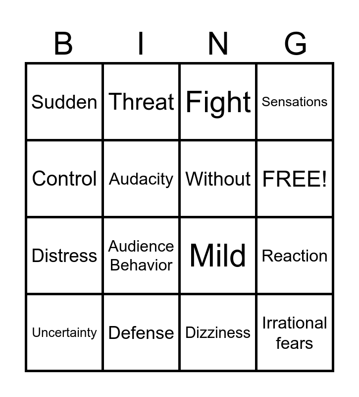 This bingo card has 16 words: Defense, Reaction, Fight, Sudden, Distress, Threat, Mild, Dizziness, Control, Audacity, Uncertainty, Sensations, Audience Behavior, FREE!, Without and Irrational fears.