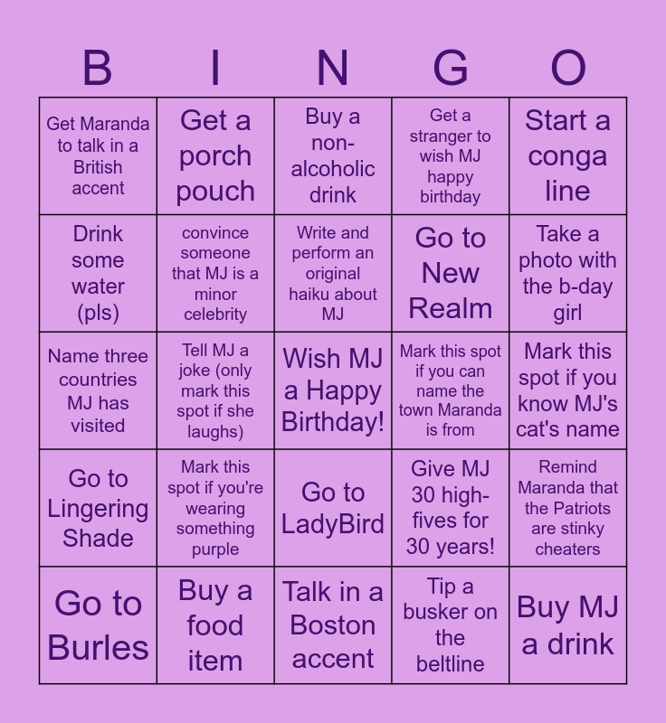This bingo card has a free space and 24 words: Mark this spot if you're wearing something purple, Buy a food item, Write and perform an original haiku about MJ, Go to Burles, Start a conga line, Get Maranda to talk in a British accent, Drink some water (pls), Get a porch pouch, Mark this spot if you can name the town Maranda is from, Go to LadyBird, Go to New Realm, Name three countries MJ has visited, Give MJ 30 high-fives for 30 years!, Remind Maranda that the Patriots are stinky cheaters, convince someone that MJ is a minor celebrity, Tip a busker on the beltline, Mark this spot if you know MJ's cat's name, Buy a non-alcoholic drink, Take a photo with the b-day girl, Tell MJ a joke (only mark this spot if she laughs), Buy MJ a drink, Go to Lingering Shade, Get a stranger to wish MJ happy birthday and Talk in a Boston accent.