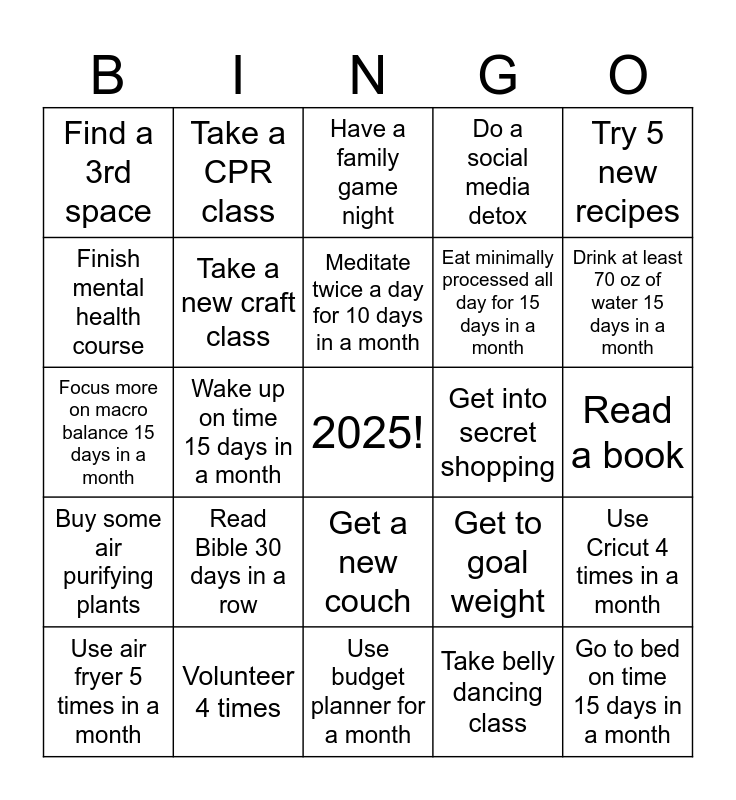 This bingo card has a free space and 24 words: Use air fryer 5 times in a month, Read Bible 30 days in a row, Meditate twice a day for 10 days in a month, Take belly dancing class, Try 5 new recipes, Find a 3rd space, Take a CPR class, Have a family game night, Get into secret shopping, Read a book, Focus more on macro balance 15 days in a month, Take a new craft class, Get to goal weight, Use Cricut 4 times in a month, Finish mental health course, Volunteer 4 times, Use budget planner for a month, Do a social media detox, Drink at least 70 oz of water 15 days in a month, Buy some air purifying plants, Wake up on time 15 days in a month, Get a new couch, Eat minimally processed all day for 15 days in a month and Go to bed on time 15 days in a month.
