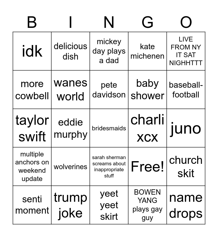 This bingo card has 25 words: wolverines, yeet yeet skirt, pete davidson, senti moment, LIVE FROM NY IT SAT NIGHHTTT, idk, more cowbell, delicious dish, charli xcx, sarah sherman screams about inappropriate stuff, baby shower, taylor swift, Free!, church skit, wanes world, name drops, juno, mickey day plays a dad, baseball-football, eddie murphy, bridesmaids, trump joke, multiple anchors on weekend update, kate michenen and BOWEN YANG plays gay guy.