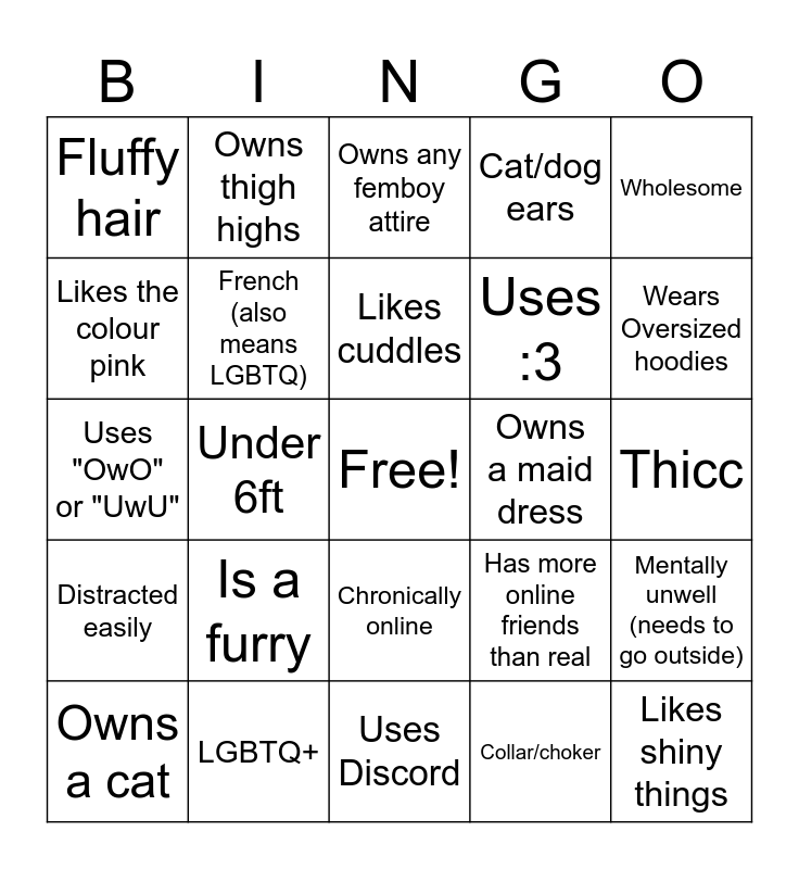 This bingo card has a free space and 24 words: Is a furry, LGBTQ+, Likes cuddles, Owns a cat, Wholesome, Fluffy hair, Likes the colour pink, Owns thigh highs, Owns a maid dress, Chronically online, Uses :3, Uses "OwO" or "UwU", Has more online friends than real, Mentally unwell (needs to go outside), French (also means LGBTQ), Collar/choker, Thicc, Owns any femboy attire, Wears Oversized hoodies, Under 6ft, Likes shiny things, Distracted easily, Cat/dog ears and Uses Discord.