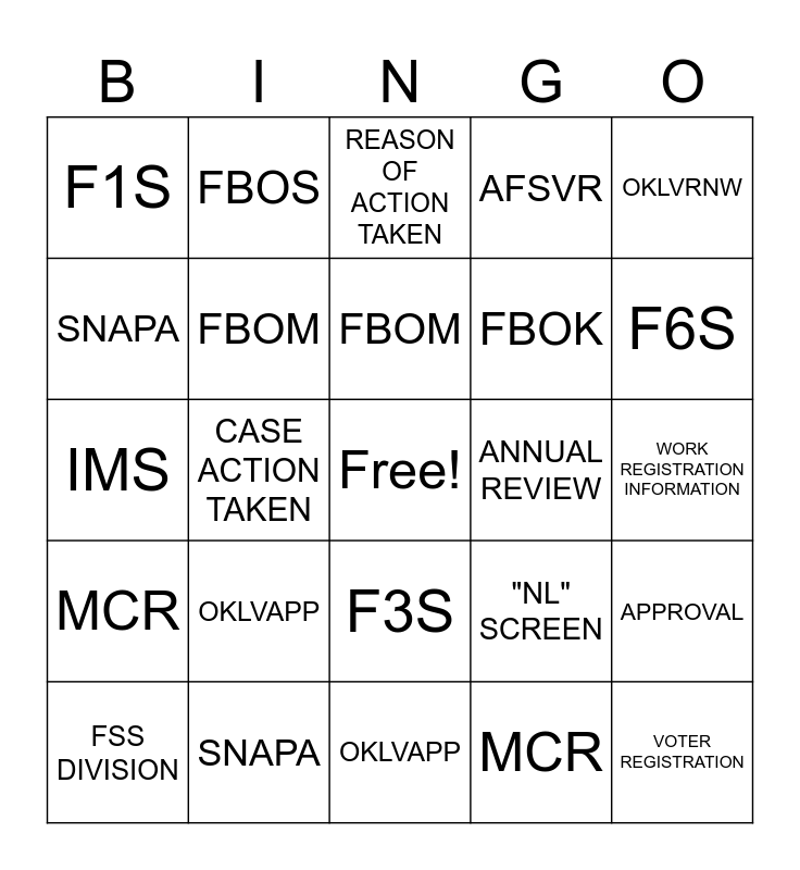 This bingo card has a free space and 68 words: AFSVR, VOTER REGISTRATION, FBOSK, FSS DIVISION, F6S, IMS, FBOS, NI, FBOM, QUERY, F3S, ADM-92, WORK REGISTRATION INFORMATION, OKLVRNW, ANNUAL REVIEW, SNAPA, CASE ACTION TAKEN, F1S, RECERTIFICATIONS, OKLVAPP, FBOK, "NL" SCREEN, MCR, FBOSNAP, PASSIVE RENEWAL, CASE CLOSURE, MISSED INTERVIEW, APPOINTMENT, APPROVAL, REQUEST DATE, REASON OF ACTION TAKEN, FSP16, PSNDCPA, F2, AFSVR, VOTER REGISTRATION, FBOSK, FSS DIVISION, F6S, IMS, FBOS, NI, FBOM, QUERY, F3S, ADM-92, WORK REGISTRATION INFORMATION, OKLVRNW, ANNUAL REVIEW, SNAPA, CASE ACTION TAKEN, F1S, RECERTIFICATIONS, OKLVAPP, FBOK, "NL" SCREEN, MCR, FBOSNAP, PASSIVE RENEWAL, CASE CLOSURE, MISSED INTERVIEW, APPOINTMENT, APPROVAL, REQUEST DATE, REASON OF ACTION TAKEN, FSP16, PSNDCPA and F2.
