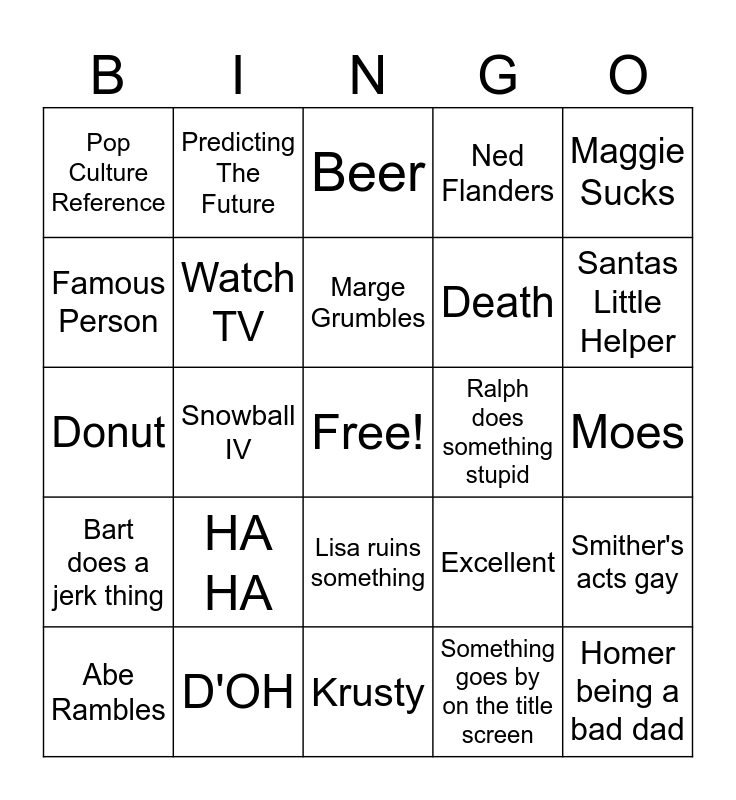 This bingo card has a free space and 24 words: HA HA, D'OH, Marge Grumbles, Abe Rambles, Maggie Sucks, Pop Culture Reference, Famous Person, Predicting The Future, Ralph does something stupid, Lisa ruins something, Death, Donut, Excellent, Smither's acts gay, Watch TV, Something goes by on the title screen, Moes, Beer, Santas Little Helper, Snowball IV, Homer being a bad dad, Bart does a jerk thing, Ned Flanders and Krusty.