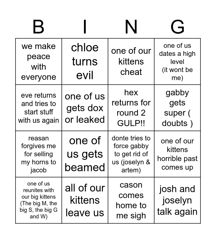 This bingo card has 16 words: all of our kittens leave us, one of our kittens horrible past comes up, one of our kittens cheat, we make peace with everyone, reasan forgives me for selling my horns to jacob, chloe turns evil, donte tries to force gabby to get rid of us (joselyn & artem), cason comes home to me sigh, eve returns and tries to start stuff with us again, one of us gets dox or leaked, one of us reunites with our big kittens (The big M, the big S, the big G and W), one of us dates a high level (it wont be me), one of us gets beamed, gabby gets super ( doubts ), hex returns for round 2 GULP!! and josh and joselyn talk again.