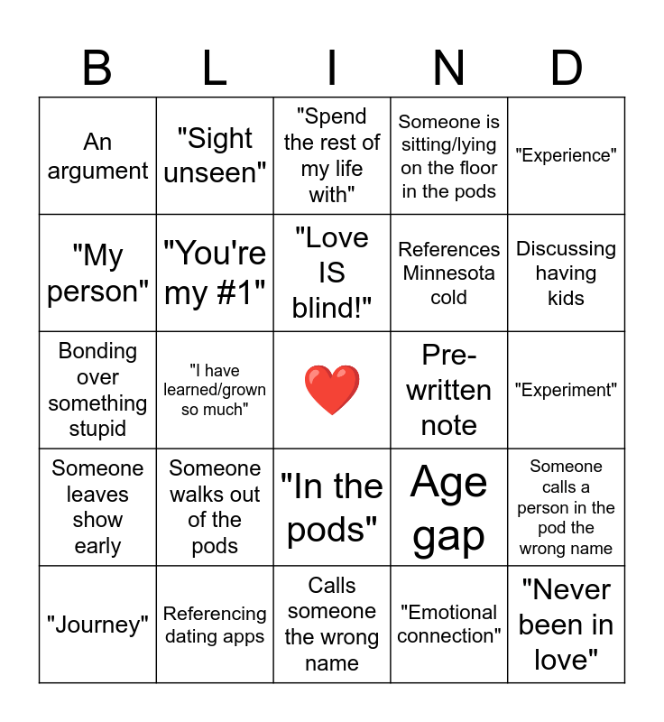 This bingo card has a free space and 64 words: "Is love truly blind?", "I'm looking for my person", Someone compares their looks to a celeb, Someone calls a person in the pod the wrong name, 2 people passive aggressively interested in the same person, Someone cries, "Sight unseen", "In the real world", "Love IS blind!", Nick Lachey makes a bad pun, "In the pods", Gold cups, "Experiment", "Experience", "My truth", "My person", "I have learned/grown so much", An argument, You know someone who knows someone onscreen, References Minnesota cold, Someone walks out of the pods, Someone leaves show early, Someone is sitting/lying on the floor in the pods, "Soulmate", Someone tries to find out about another's appearance, "I've struggled with relationships", Someone touches the pod divider, Someone falls in love in the first episode, "I've never met anyone like you", View of the cherry on a spoon, View of the Stone Arch Bridge, View of the Minneapolis skyline, View of the US Bank Stadium, "I'm Nick Lachey", Discussing having kids, "Journey", Awkward silence, "Emotional connection", "Who's this?", "You're my #1", Bonding over something stupid, Pre-written note, "That's my ___'s name", "I wish I could hug/kiss you", Deep dark secret reveal, "Never been in love", Referencing dating apps, "The pods are open!", Age gap, Emotional breakdown, Complaining about the MN dating scene, Someone proposes, Calls someone the wrong name, Thick MN accent, Someone references a MN sports team, Someone works in healthcare, "Spend the rest of my life with", Talking about the wedding, "Walk away forever", "I love you", "Ope", Awkward reveal, Snowy shot and "___est season yet".