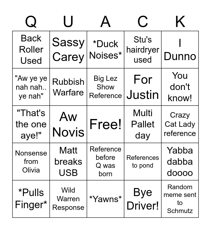 This bingo card has a free space and 24 words: Matt breaks USB, Wild Warren Response, Big Lez Show Reference, *Pulls Finger*, I Dunno, Back Roller Used, "Aw ye ye nah nah.. ye nah", Sassy Carey, Multi Pallet day, Reference before Q was born, For Justin, "That's the one aye!", References to pond, Yabba dabba doooo, Rubbish Warfare, Bye Driver!, Crazy Cat Lady reference, *Duck Noises*, You don't know!, Aw Novis, Random meme sent to Schmutz, Nonsense from Olivia, Stu's hairdryer used and *Yawns*.