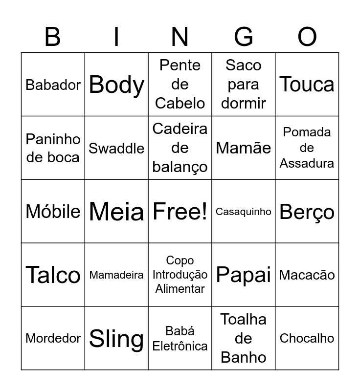 This bingo card has a free space and 50 words: Carrinho de bebê, Chocalho, Chupeta, Babá Eletrônica, Mamadeira, Almofada de Amamentação, Body, Cueiro, Paninho de boca, Vovó, Swaddle, Saco para dormir, Macacão, Papai, Fralda, Lenço Umedecido, Cadeira de balanço, Casaquinho, Luva, Touca, Meia, Toalha de Banho, Babador, Mamãe, Manta, Cobertor, Pomada de Assadura, Naninha, Pente de Cabelo, Copo Introdução Alimentar, Extrator de Leite, Dindo, Cadeirinha de Carro, Dinda, Sling, Canguru, Ninho Redutor, Moisés, Mosqueteiro, Berço, Poltrona de Amamentar, Trocador, Macaquinho, Tapete de atividades, Mordedor, Móbile, Banheira, Vovô, Talco and Coletor de Leite.
