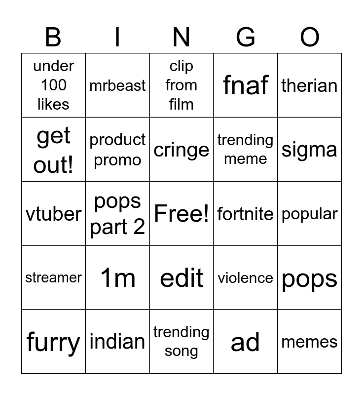 This bingo card has a free space and 24 words: 1m, indian, cringe, furry, therian, under 100 likes, get out!, mrbeast, fortnite, edit, trending meme, vtuber, violence, pops, product promo, ad, popular, clip from film, sigma, pops part 2, memes, streamer, fnaf and trending song.