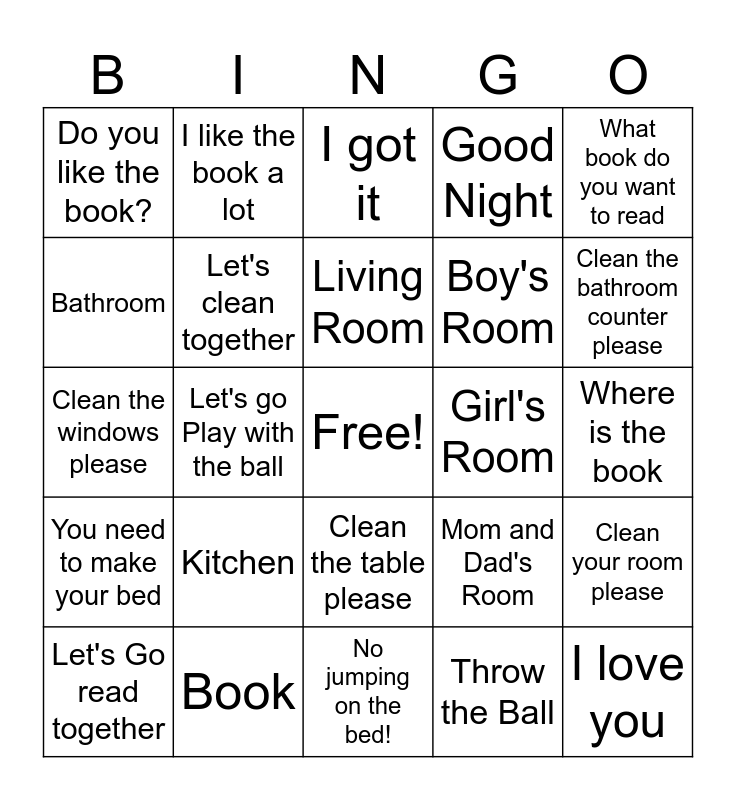 This bingo card has a free space and 24 words: Kitchen, Book, Living Room, Let's Go read together, What book do you want to read, Do you like the book?, Bathroom, I like the book a lot, Girl's Room, Clean the table please, Boy's Room, Clean the windows please, Mom and Dad's Room, Clean your room please, Let's clean together, Throw the Ball, Where is the book, I got it, Clean the bathroom counter please, Let's go Play with the ball, I love you, You need to make your bed, Good Night and No jumping on the bed!.