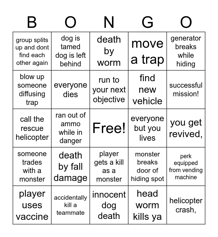 This bingo card has a free space and 31 words: innocent dog death, snowmobile runs out of gas, ran out of ammo while in danger, flipped snowmobile, group splits up and dont find each other again, death by worm, everyone dies, monster breaks door of hiding spot, everyone but you lives, head worm kills ya, you get revived,, helicopter crash,, kill an infected teammate,, helicopter safely landed, successful mission!, death by scary monster,, perk equipped from vending machine, death by fall damage, someone trades with a monster, player gets a kill as a monster, generator breaks while hiding, trap blows up, player uses vaccine, dog is tamed dog is left behind, find new vehicle, blow up someone diffusing trap, move a trap, call the rescue helicopter, accidentally kill a teammate, run to your next objective and Aj takes off on everyone.