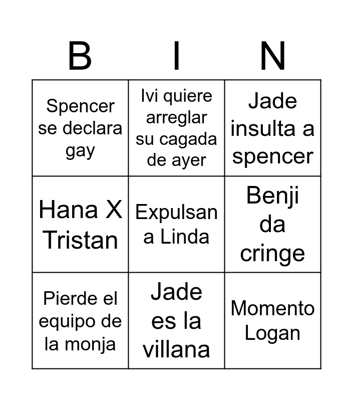 This bingo card has a free space and 8 words: Benji da cringe, Jade insulta a spencer, Ivi quiere arreglar su cagada de ayer, Pierde el equipo de la monja, Spencer se declara gay, Momento Logan, Hana X Tristan and Jade es la villana.