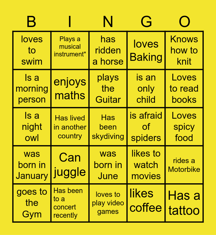 This bingo card has 30 words: Has been to a concert recently, Is left-handed, Has lived in another country, has a younger brother, loves to swim, has ridden a horse, enjoys maths, was born in June, is afraid of spiders, loves to play video games, Loves spicy food, Has been skydiving, likes coffee, Has a tattoo, Loves to read books, Is a vegetarian, likes to watch movies, was born in January, Can juggle, Knows how to knit, Is a night owl, Loves Pizza, Plays a musical instrument", is an only child, Is a morning person, loves Baking, rides a Motorbike, goes to the Gym, plays the Guitar and loves cooking.