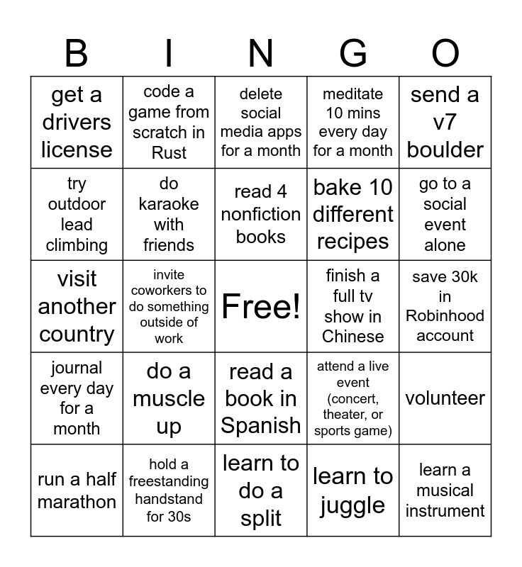 This bingo card has a free space and 24 words: do a muscle up, hold a freestanding handstand for 30s, read 4 nonfiction books, run a half marathon, send a v7 boulder, get a drivers license, try outdoor lead climbing, code a game from scratch in Rust, finish a full tv show in Chinese, read a book in Spanish, bake 10 different recipes, visit another country, attend a live event (concert, theater, or sports game), volunteer, do karaoke with friends, learn to juggle, save 30k in Robinhood account, delete social media apps for a month, go to a social event alone, invite coworkers to do something outside of work, learn a musical instrument, journal every day for a month, meditate 10 mins every day for a month and learn to do a split.