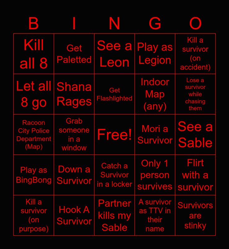 This bingo card has a free space and 24 words: Down a Survivor, Hook A Survivor, Get Flashlighted, Kill a survivor (on purpose), Kill a survivor (on accident), Kill all 8, Let all 8 go, Get Paletted, Mori a Survivor, Catch a Survivor in a locker, Indoor Map (any), Racoon City Police Department (Map), Only 1 person survives, Flirt with a survivor, Shana Rages, A survivor as TTV in their name, See a Sable, See a Leon, Lose a survivor while chasing them, Grab someone in a window, Survivors are stinky, Play as BingBong, Play as Legion and Partner kills my Sable.