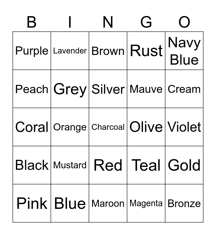 This bingo card has 30 words: Blue, Green, Orange, Yellow, Purple, Brown, Grey, Red, Olive, Maroon, Violet, Charcoal, Magenta, Bronze, Cream, Tan, Teal, Black, Mustard, Navy Blue, Coral, Burgundy, Lavender, Mauve, Peach, Rust, Gold, Pink, Silver and Cyan.