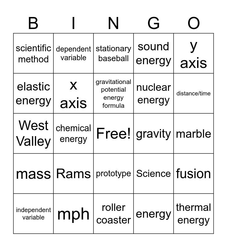This bingo card has a free space and 34 words: speed, energy, kinetic energy, potential energy, mass, x axis, y axis, independent variable, dependent variable, greatest KE, gravitational potential energy formula, stationary baseball, ping pong ball thrown at fast speed, semi truck moving at high speed, gravity, distance/time, mph, West Valley, Rams, Science, prototype, engineer, scientific method, marble, roller coaster, thermal energy, sound energy, electrical energy, nuclear energy, elastic energy, radiation energy, chemical energy, fusion and fission.