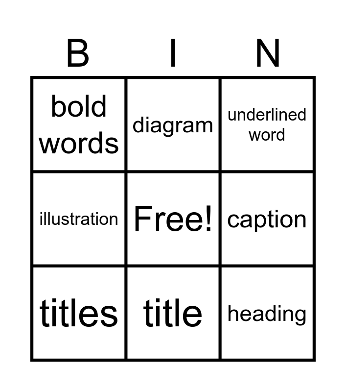 This bingo card has a free space and 12 words: photograph, bold word, heading, caption, diagram, underlined word, title, illustration, bold words, illustration, titles and captions.