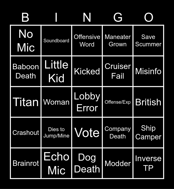 This bingo card has a free space and 24 words: Dies to Jump/Mine, Echo Mic, Kicked, Brainrot, Save Scummer, No Mic, Baboon Death, Soundboard, Offense/Exp, Vote, Cruiser Fail, Titan, Company Death, Ship Camper, Little Kid, Modder, British, Offensive Word, Misinfo, Woman, Inverse TP, Crashout, Maneater Grown and Dog Death.