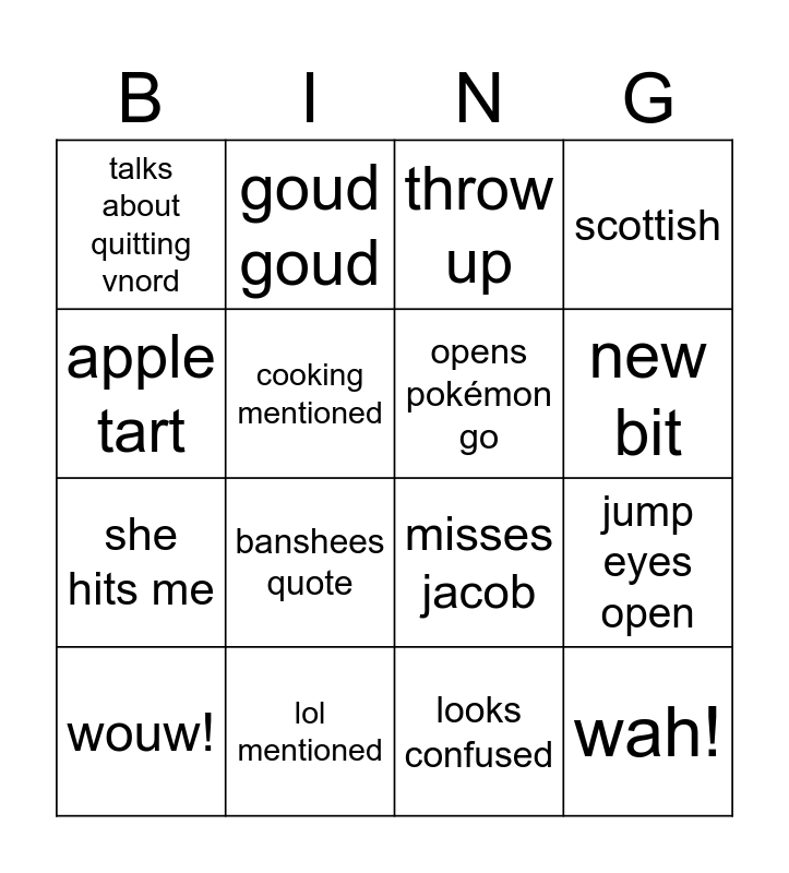 This bingo card has 17 words: looks confused, wouw!, throw up, talks about quitting vnord, banshees quote, scottish, jump eyes open, opens pokémon go, new bit, cooking mentioned, lol mentioned, misses jacob, apple tart, goud goud, she hits me, attacks somebody and wah!.