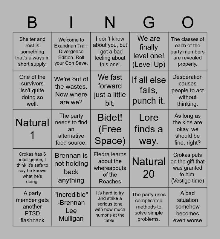 This bingo card has a free space and 24 words: Brennan is not holding back anything, "Incredible" -Brennan Lee Mulligan, We fast forward just a little bit., A party member gets another PTSD flashback, The classes of each of the party members are revealed properly., Shelter and rest is something that's always in short supply., One of the survivors isn't quite doing so well., Welcome to Exandrian Trail- Divergence Edition. Roll your Con Save., Lore finds a way., Fiedra learns about the whereabouts of the Roaches, If all else fails, punch it., Natural 1, Natural 20, Crokas puts on the gift that was granted to him. (Vestige time), We're out of the wastes. Now where are we?, The party uses complicated methods to solve simple problems., As long as the kids are okay, we should be fine, right?, I don't know about you, but I got a bad feeling about this one., Desperation causes people to act without thinking., The party needs to find an alternative food source., A bad situation somehow becomes even worse, Crokas has 6 intelligence, I think it's safe to say he knows what he's doing., We are finally level one! (Level Up) and It's hard to try and strike a serious tone with how much humor's at the table..