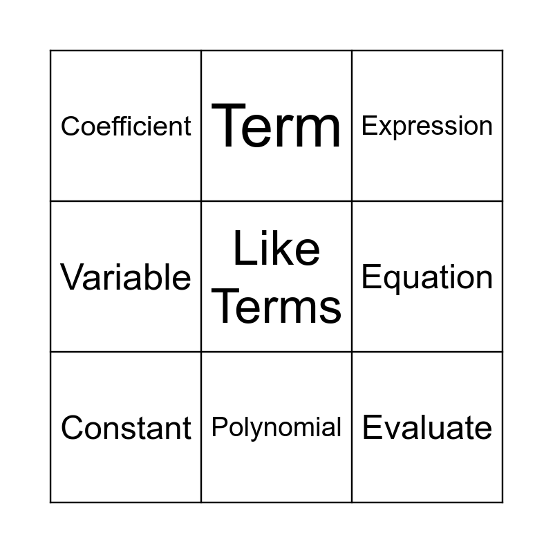 This bingo card has a free space and 8 words: Variable, Term, Equation, Constant, Expression, Coefficient, Polynomial and Evaluate.