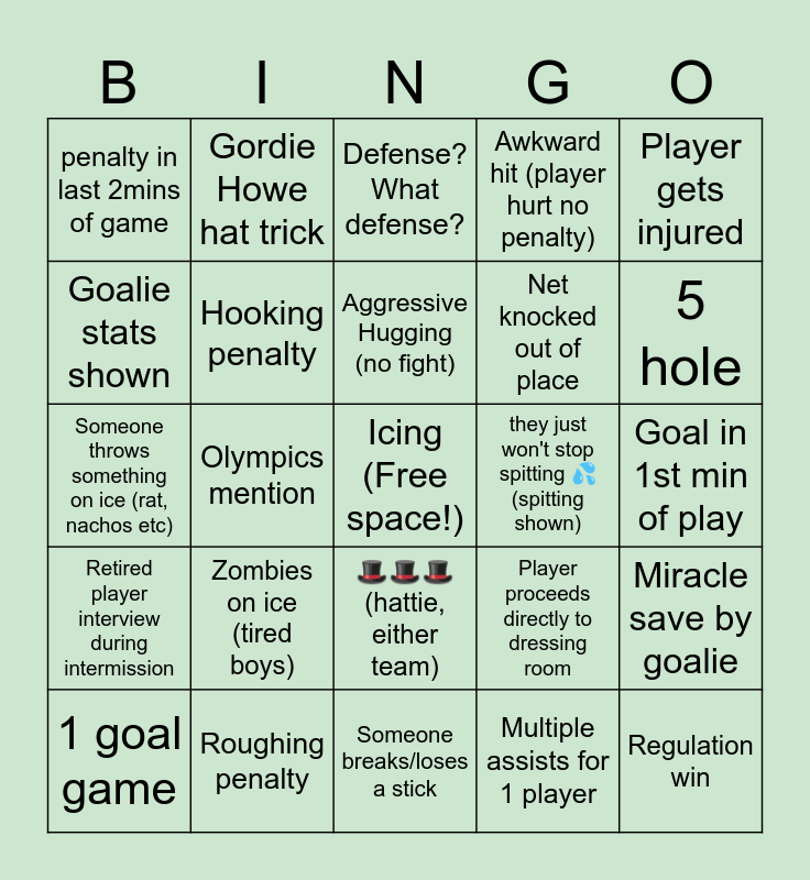 This bingo card has a free space and 90 words: Team Canada goal, Team Finland goal, π©π©π© (hattie, either team), BLOOD ON THE ICE π©Έ, Hot Potato Puck π₯, Big, erect, towering PP π (PP goal), Successful PK, The crowd boos, Good anthem singer, Bad anthem singer, Offside, Please I am begging you to shoot π, Bonus hockey (OT), Goal in 1st min of play, TING! Shot hits post/bar (no goal), Aggressive Hugging (no fight), Dreaded Shoot out π, Actual fight (with punching), Stanley Cup mention, Aggressive mouth guard chewing, High sticking penalty, Fight stopped before it can start, Someone breaks/loses a stick, Goalie equipment malfunction, Someone throws something on ice (rat, nachos etc), Roughing penalty, Refs miss blatant call, Puck in netting, Unintentional Innuendo π, Goalie does the splits, Too many men penalty, Miracle save by goalie, Puck goes into audience, Retired player interview during intermission, penalty in last 2mins of game, Awkward hit (player hurt no penalty), Defense? What defense?, Face-off winner graphic shown, Olympics mention, 5 hole, 1 goal game, Goalie stats shown, Footage/photo from old game shown, Completely avoidable penalty in OT, 5 on 3 happens, Player proceeds directly to dressing room, Chirping, Very Seriousβ’ goal celebration (no smiles), Losing team has more SOGs, Player stats shown, Breakaway goal, Net knocked out of place, McDavid skates through like 5 players, 4 on 4 happens, Goofy Celly, Player's family shown in audience, they just won't stop spitting π¦(spitting shown), Deflection goal, NHL team rivalries emerge, League ranking mentioned (any player), Puck whistled down in 1st min of play, Players giggling on bench, Player lays on the ice to block a shot, OT win, Penalty in 1st min of play, Celebrity from another sport makes an appearance, Goal from defensive player, Multiple assists for 1 player, Goalie gets pulled, Politician in audience, Zombies on ice (tired boys), Regulation win, Ref cam footage shown, Empty net goal, Gordie Howe hat trick, Hooking penalty, Florida Panthers mention, Dallas Stars mention, Boston Bruins mention, Bad giveaway leads to goal, Announcers mix up two players, Player gets injured, Cute goalie on bench, Team Finland penalty, Announcers butcher names, Announcers depreciate game to talk about Can/USA, Goalie goes on his own little adventure, Team Canada penalty, Shot over 90mph and Player close-up.