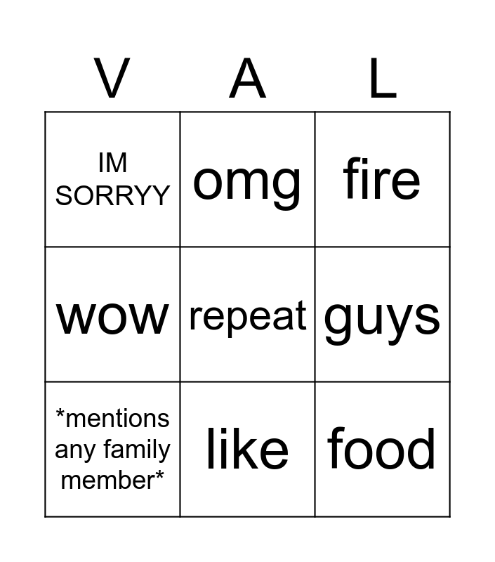This bingo card has a free space and 8 words: guys, fire, omg, *mentions any family member*, IM SORRYY, food, wow and like.
