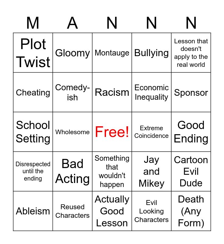 This bingo card has a free space and 24 words: Bad Acting, Reused Characters, Racism, Ableism, Lesson that doesn't apply to the real world, Plot Twist, Cheating, Gloomy, Extreme Coincidence, Something that wouldn't happen, Economic Inequality, School Setting, Jay and Mikey, Cartoon Evil Dude, Comedy-ish, Evil Looking Characters, Good Ending, Montauge, Sponsor, Wholesome, Death (Any Form), Disrespected until the ending, Bullying and Actually Good Lesson.