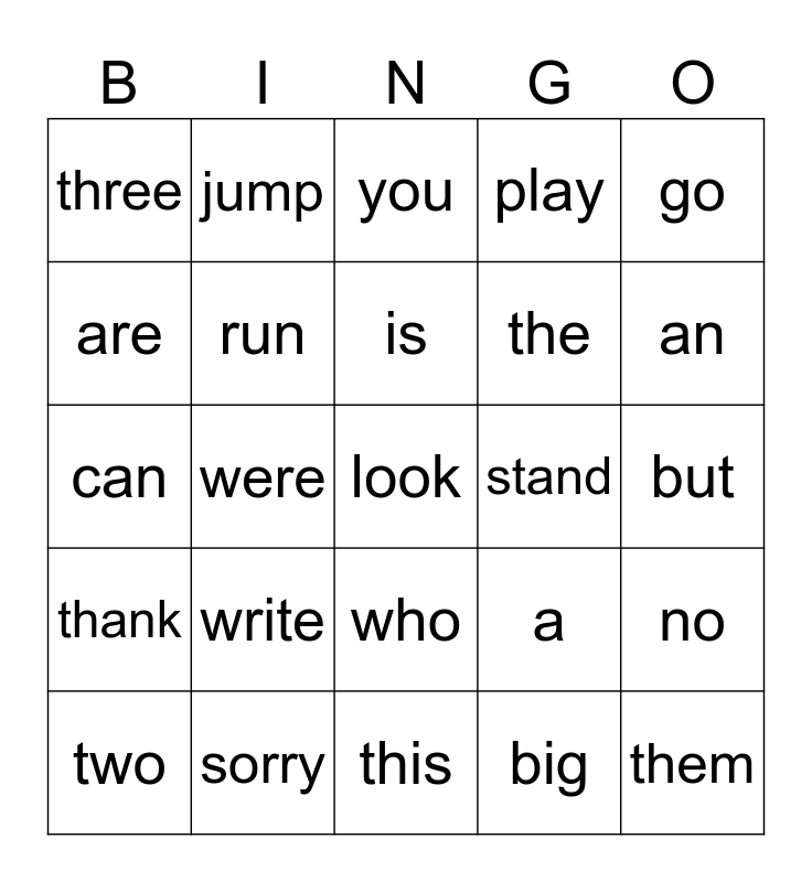 This bingo card has 76 words: Free!, I, you, he, she, we, me, my, it, they, them, am, is, are, was, were, see, look, like, go, come, can, run, jump, play, get, in, on, under, up, down, here, there, a, an, the, and, or, but, big, little, good, bad, happy, sad, one, two, three, red, blue, yellow, who, what, where, when, why, how, eat, drink, read, write, sleep, sing, dance, walk, sit, stand, open, close, yes, no, thank, sorry, please, this and that.