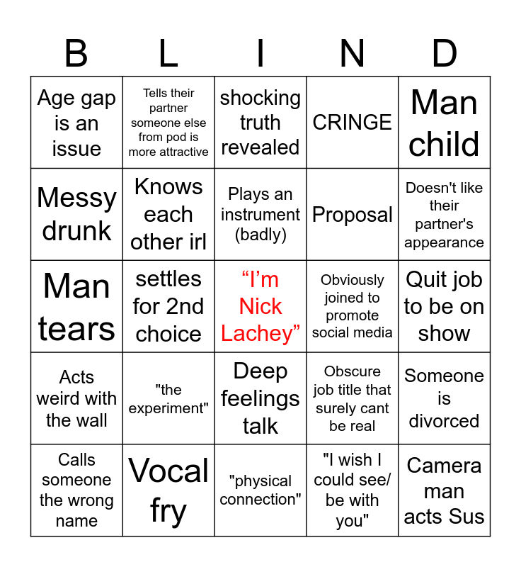 This bingo card has a free space and 24 words: "the experiment", Vocal fry, Plays an instrument (badly), Calls someone the wrong name, Man child, Age gap is an issue, Messy drunk, Tells their partner someone else from pod is more attractive, Obviously joined to promote social media, Deep feelings talk, Proposal, Man tears, Obscure job title that surely cant be real, Someone is divorced, Knows each other irl, "I wish I could see/ be with you", Quit job to be on show, shocking truth revealed, Doesn't like their partner's appearance, settles for 2nd choice, Camera man acts Sus, Acts weird with the wall, CRINGE and "physical connection".