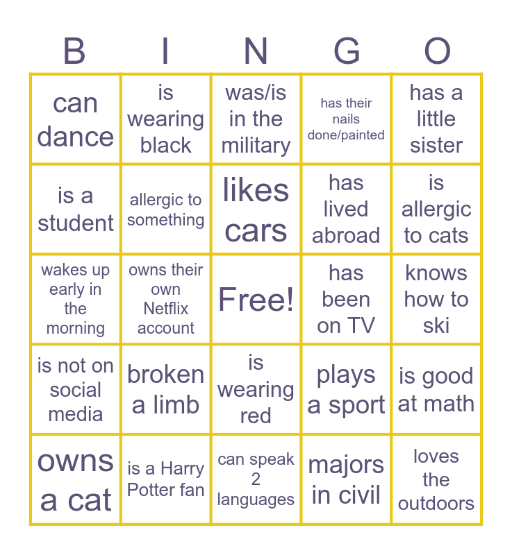 This bingo card has a free space and 54 words: Lives in another state, is not on social media, Owns a business or has a side hustle, Has met a celebrity, is wearing red, loves to travel, has their nails done/painted, is left-handed, is a student, plays a musical instrument, can dance, has a tattoo, is a Harry Potter fan, owns a cat, knows a magic trick, can speak 2 languages, loves the outdoors, has lived abroad, loves spicy food, knows how to ski, plays a sport, owns a dog, has been on TV, has a little sister, works in an office, is wearing black, majors in mechanical, majors in comp sci, majors in electrical, majors in civil, majors in environmental, has a birthday this month, is addicted to a TV show, Was born outside of the US, was/is in the military, doesn't like eggs, wakes up early in the morning, is good at math, favorite color is purple, allergic to something, plays video games, is a night owl, meditates, wears glasses, broken a limb, can program, has brown eyes, collects something, likes cars, owns their own Netflix account, is allergic to cats, owns a bird, is vegan and can a change a tire.