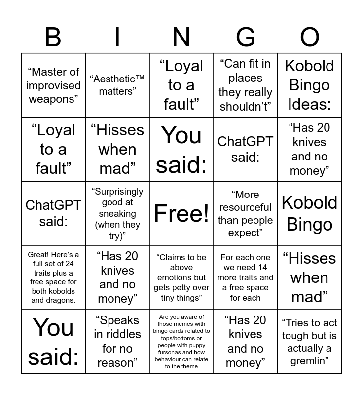 This bingo card has a free space and 93 words: ChatGPT, You said:, Are you aware of those memes with bingo cards related to tops/bottoms or people with puppy fursonas and how behaviour can relate to the theme, ChatGPT said:, Yeah, I’ve seen those! The bingo cards are usually humorous ways to poke fun at stereotypes within certain communities, like top/bottom dynamics or how people with specific fursonas (like dogs, wolves, or foxes) behave. They often list a mix of, For puppy fursonas, the bingo cards might have things like “excited by literally everything,” “head pats = instant happiness,” or “zoomies at inappropriate times.” They're lighthearted and self-aware, often playing off shared in-jokes within fan, Are you thinking of making one, or just enjoying the trend?, You said:, Yes there's 2 I'd like to make, ChatGPT said:, Nice! What are the two themes you have in mind? I can help brainstorm traits or even design a layout for them., You said:, Id like to create one for kobolds and one for dragons, ChatGPT said:, That sounds like a fun contrast! Kobolds and dragons have such distinct personalities, so the bingo cards could really play into their stereotypes., Kobold Bingo Ideas:, “Loyal to a fault”, “Tries to act tough but is actually a gremlin”, “Would die for their hoard (even if it’s just shiny rocks)”, “Accidentally sets off a trap they made”, “Hero worships a dragon”, “Can fit in places they really shouldn’t”, “Talks in third person sometimes”, “Easily bribed with snacks”, “Has 20 knives and no money”, “Hisses when mad”, Dragon Bingo Ideas:, “Massive hoarder (gold, books, memes—anything counts)”, “Thinks they are way smarter than they actually are”, “Has a dramatic entrance for everything”, “Speaks in riddles for no reason”, “Claims to be above emotions but gets petty over tiny things”, “Has minions (willing or otherwise)”, “Goes feral over food”, “Aesthetic™ matters”, “Big ego, bigger nap schedule”, “Secretly soft but will never admit it”, Would you want me to format these into an actual bingo card design, or do you want to tweak the traits first?, You said:, For each one we need 14 more traits and a free space for each, ChatGPT said:, Great! Here’s a full set of 24 traits plus a free space for both kobolds and dragons., Kobold Bingo, “Loyal to a fault”, “Tries to act tough but is actually a gremlin”, “Would die for their hoard (even if it’s just shiny rocks)”, “Accidentally sets off a trap they made”, “Hero worships a dragon”, “Can fit in places they really shouldn’t”, “Talks in third person sometimes”, “Easily bribed with snacks”, “Has 20 knives and no money”, “Hisses when mad”, “Knows one really specific, useless fact”, “Somehow both cowardly and reckless”, “Makes friends way too fast”, “Gets distracted by something shiny mid-conversation”, “More resourceful than people expect”, “Master of improvised weapons”, “Thinks ‘numbers go up’ means they are unstoppable”, “Surprisingly good at sneaking (when they try)”, “Overly dramatic death scenes”, “Will fight something way out of their league”, “Has weirdly specific rules for their hoard”, “Probably lives in a pile of blankets”, “Always the underdog, always scrappy”, “Proud of their tiny but mighty status”, **FREE SPACE: ** "Yips excitedly", “Loyal to a fault”, “Tries to act tough but is actually a gremlin”, “Would die for their hoard (even if it’s just shiny rocks)”, “Accidentally sets off a trap they made”, “Hero worships a dragon”, “Can fit in places they really shouldn’t”, “Talks in third person sometimes”, “Easily bribed with snacks”, “Has 20 knives and no money”, “Hisses when mad”, “Knows one really specific, useless fact”, “Somehow both cowardly and reckless”, “Makes friends way too fast”, “Gets distracted by something shiny mid-conversation”, “More resourceful than people expect”, “Master of improvised weapons”, “Thinks ‘numbers go up’ means they are unstoppable”, “Surprisingly good at sneaking (when they try)”, “Overly dramatic death scenes”, “Will fight something way out of their league”, “Has weirdly specific rules for their hoard”, “Probably lives in a pile of blankets”, “Always the underdog, always scrappy”, “Proud of their tiny but mighty status” and **FREE SPACE: ** "Yips excitedly".