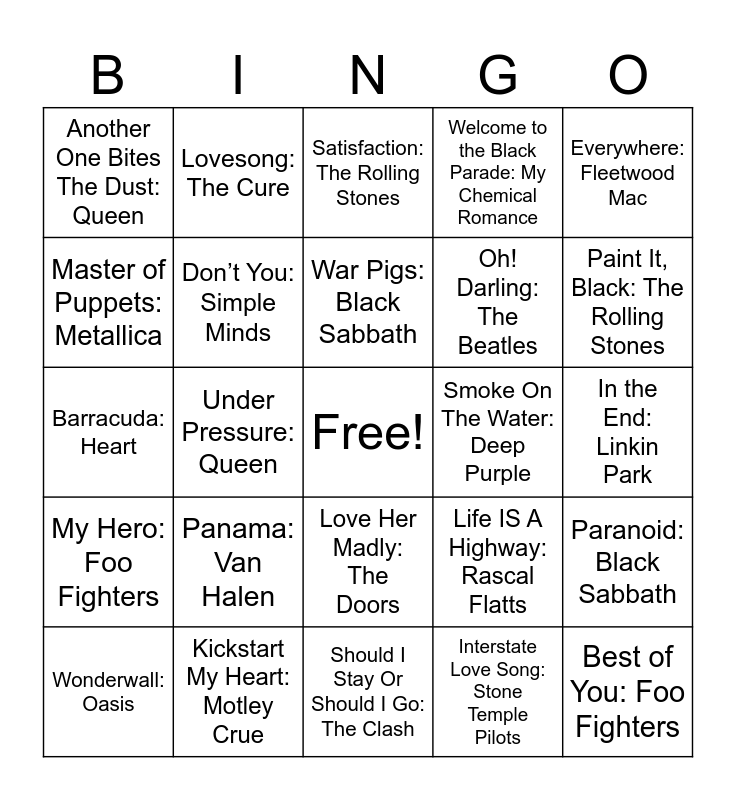 This bingo card has a free space and 55 words: Dreams: Fleetwood Mac, Wonderwall: Oasis, Come As You Are: Nirvana, Another One Bites The Dust: Queen, Should I Stay Or Should I Go: The Clash, Somebody Told Me: The Killers, Don’t You: Simple Minds, Life In The Fast Lane: Eagles, Oh! Darling: The Beatles, Back In Black: AC/DC, Welcome to the Black Parade: My Chemical Romance, Come Together: The Beatles, Linger: The Cranberries, Sweet Child O’Mine: Guns N’ Roses, American Idiot: Green Day, Rockstart: Nickelback, Everywhere: Fleetwood Mac, Under Pressure: Queen, Viva La Vida: Coldplay, Best of You: Foo Fighters, Smoke On The Water: Deep Purple, Don’t Stop Believe: Journey, Life IS A Highway: Rascal Flatts, Satisfaction: The Rolling Stones, Fortunate Son: Creedence Clearwater Revival, War Pigs: Black Sabbath, Interstate Love Song: Stone Temple Pilots, Killing In The Name: Rage Against The Machine, In the End: Linkin Park, Paranoid: Black Sabbath, Plush: Stone Temple Pilots, Tom Sawyer: Rush, Simple Man: Lynyrd Skynyrd, Long Cool Woman: The Hollies, Master of Puppets: Metallica, Barracuda: Heart, Can’t Stop: Red Hot Chili Peppers, My Hero: Foo Fighters, The Kids Aren’t Alright: The Offspring, How You Remind Me: Nickelback, Lovesong: The Cure, Shout: Tears For Fears, Fat Bottomed Girls: Queen, Hungry Like the Wold: Duran Duran, Panama: Van Halen, Kickstart My Heart: Motley Crue, Nothin’ But A Good Time: Poison, Another Brick in the Wall: Pink Floyd, Proud Mary: Creedence Clearwater Revival, Paint It, Black: The Rolling Stones, My Girl: The Temptations, Dancing Queen: ABBA, ABC: The Jackson 5, Love Her Madly: The Doors and I Get Around: The Beach Boys.