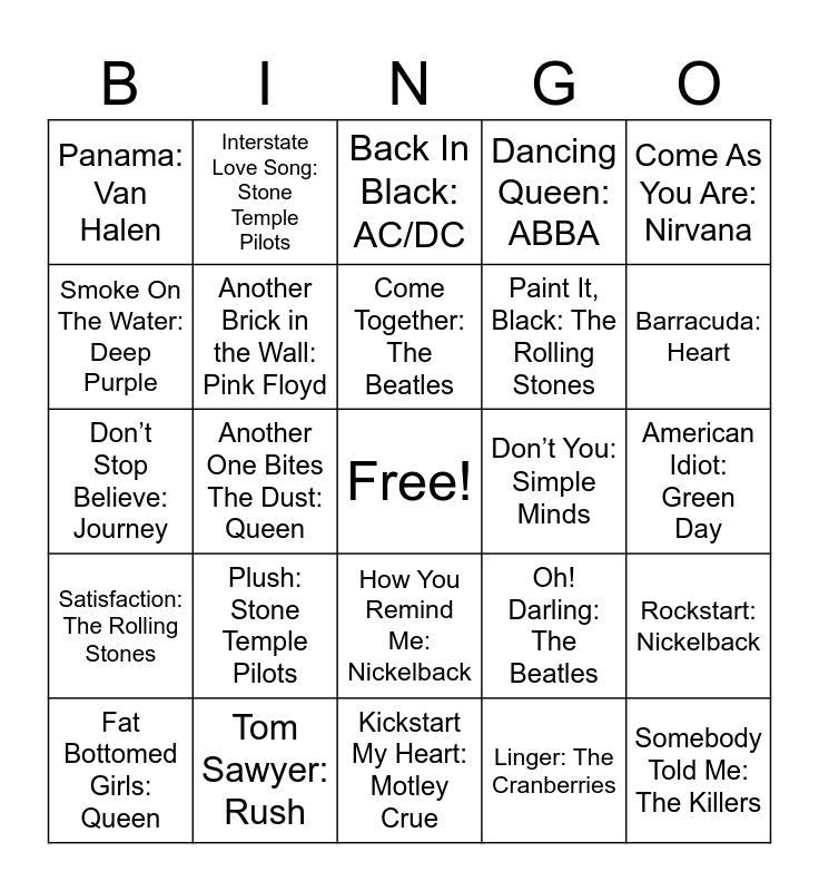 This bingo card has a free space and 55 words: Shout: Tears For Fears, Fat Bottomed Girls: Queen, Hungry Like the Wold: Duran Duran, Panama: Van Halen, Kickstart My Heart: Motley Crue, Nothin’ But A Good Time: Poison, Another Brick in the Wall: Pink Floyd, Proud Mary: Creedence Clearwater Revival, Paint It, Black: The Rolling Stones, My Girl: The Temptations, Dancing Queen: ABBA, ABC: The Jackson 5, Love Her Madly: The Doors, I Get Around: The Beach Boys, Dreams: Fleetwood Mac, Wonderwall: Oasis, Come As You Are: Nirvana, Another One Bites The Dust: Queen, Should I Stay Or Should I Go: The Clash, Somebody Told Me: The Killers, Don’t You: Simple Minds, Life In The Fast Lane: Eagles, Oh! Darling: The Beatles, Back In Black: AC/DC, Welcome to the Black Parade: My Chemical Romance, Come Together: The Beatles, Linger: The Cranberries, Sweet Child O’Mine: Guns N’ Roses, American Idiot: Green Day, Rockstart: Nickelback, Everywhere: Fleetwood Mac, Under Pressure: Queen, Viva La Vida: Coldplay, Best of You: Foo Fighters, Smoke On The Water: Deep Purple, Don’t Stop Believe: Journey, Life IS A Highway: Rascal Flatts, Satisfaction: The Rolling Stones, Fortunate Son: Creedence Clearwater Revival, War Pigs: Black Sabbath, Interstate Love Song: Stone Temple Pilots, Killing In The Name: Rage Against The Machine, In the End: Linkin Park, Paranoid: Black Sabbath, Plush: Stone Temple Pilots, Tom Sawyer: Rush, Simple Man: Lynyrd Skynyrd, Long Cool Woman: The Hollies, Master of Puppets: Metallica, Barracuda: Heart, Can’t Stop: Red Hot Chili Peppers, My Hero: Foo Fighters, The Kids Aren’t Alright: The Offspring, How You Remind Me: Nickelback and Lovesong: The Cure.