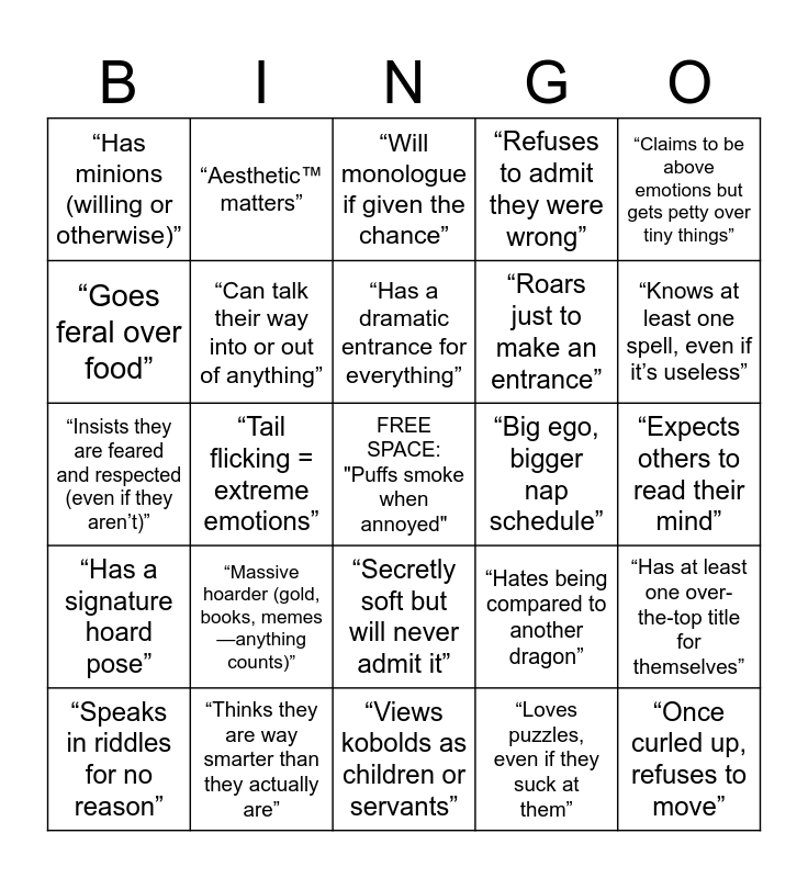 This bingo card has a free space and 24 words: “Massive hoarder (gold, books, memes—anything counts)”, “Thinks they are way smarter than they actually are”, “Has a dramatic entrance for everything”, “Speaks in riddles for no reason”, “Claims to be above emotions but gets petty over tiny things”, “Has minions (willing or otherwise)”, “Goes feral over food”, “Aesthetic™ matters”, “Big ego, bigger nap schedule”, “Secretly soft but will never admit it”, “Roars just to make an entrance”, “Insists they are feared and respected (even if they aren’t)”, “Hates being compared to another dragon”, “Has at least one over-the-top title for themselves”, “Can talk their way into or out of anything”, “Loves puzzles, even if they suck at them”, “Expects others to read their mind”, “Will monologue if given the chance”, “Knows at least one spell, even if it’s useless”, “Tail flicking = extreme emotions”, “Once curled up, refuses to move”, “Has a signature hoard pose”, “Refuses to admit they were wrong” and “Views kobolds as children or servants”.