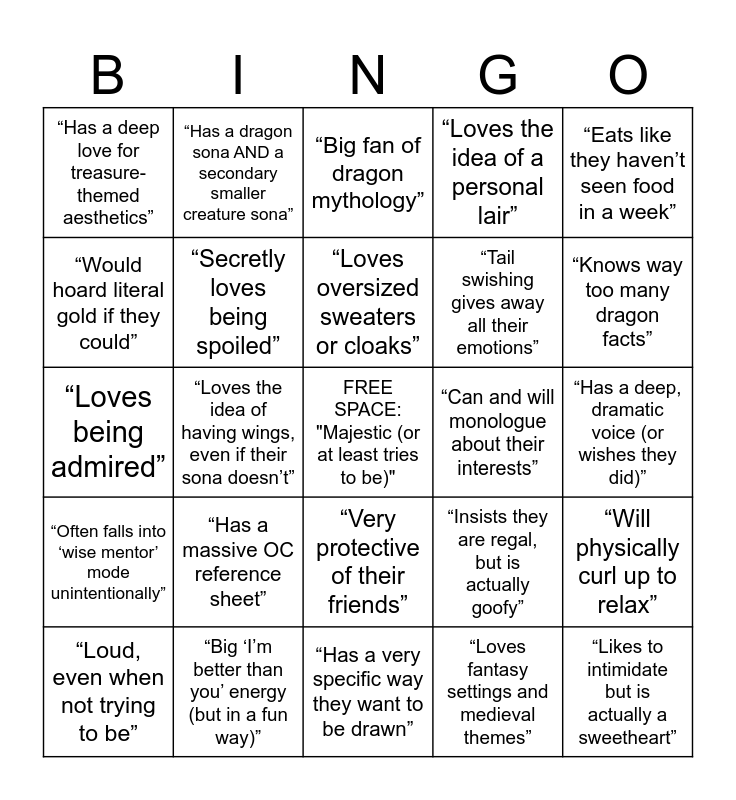 This bingo card has a free space and 24 words: “Has a massive OC reference sheet”, “Big ‘I’m better than you’ energy (but in a fun way)”, “Loves oversized sweaters or cloaks”, “Loud, even when not trying to be”, “Eats like they haven’t seen food in a week”, “Has a deep love for treasure-themed aesthetics”, “Would hoard literal gold if they could”, “Has a dragon sona AND a secondary smaller creature sona”, “Can and will monologue about their interests”, “Very protective of their friends”, “Tail swishing gives away all their emotions”, “Loves being admired”, “Insists they are regal, but is actually goofy”, “Will physically curl up to relax”, “Secretly loves being spoiled”, “Loves fantasy settings and medieval themes”, “Has a deep, dramatic voice (or wishes they did)”, “Big fan of dragon mythology”, “Knows way too many dragon facts”, “Loves the idea of having wings, even if their sona doesn’t”, “Likes to intimidate but is actually a sweetheart”, “Often falls into ‘wise mentor’ mode unintentionally”, “Loves the idea of a personal lair” and “Has a very specific way they want to be drawn”.