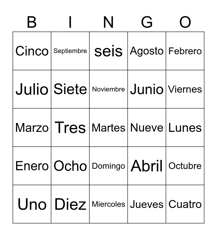 This bingo card has 29 words: Uno, Dos, Tres, Cuatro, Cinco, seis, Siete, Ocho, Nueve, Diez, Lunes, Martes, Miercoles, Jueves, Viernes, Sabado, Domingo, Enero, Febrero, Marzo, Abril, Mayo, Junio, Julio, Agosto, Septiembre, Octubre, Noviembre and Diciembre.