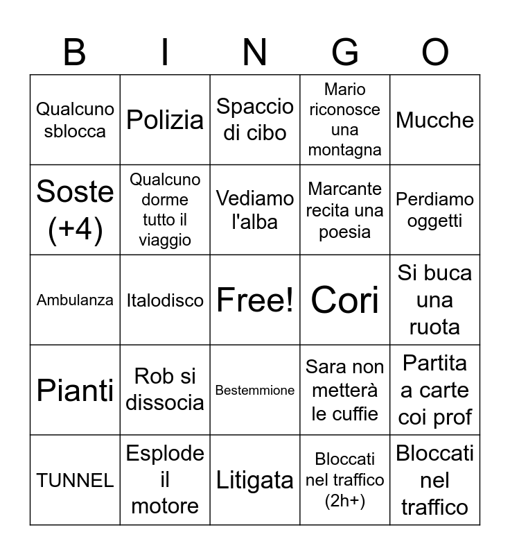 This bingo card has a free space and 30 words: Esplode il motore, Violazione leggi della strada, Italodisco, Actual Italodisco, Qualcuno sblocca, Spaccio di cibo, Qualcuno dorme tutto il viaggio, Bestemmione, Cori, Litigata, Si buca una ruota, Bloccati nel traffico, Bloccati nel traffico (2h+), Ci dimentichiamo qualcuno, Perdiamo oggetti, Ora dello sbusto, Sara non metterà le cuffie, Pianti, Rob si dissocia, Mucche, Ambulanza, Autogrill, Polizia, Marcante recita una poesia, Soste (+4), Mario riconosce una montagna, Partita a carte coi prof, TUNNEL, Vediamo l'alba and Andiamo in Australia invece che in Austria.