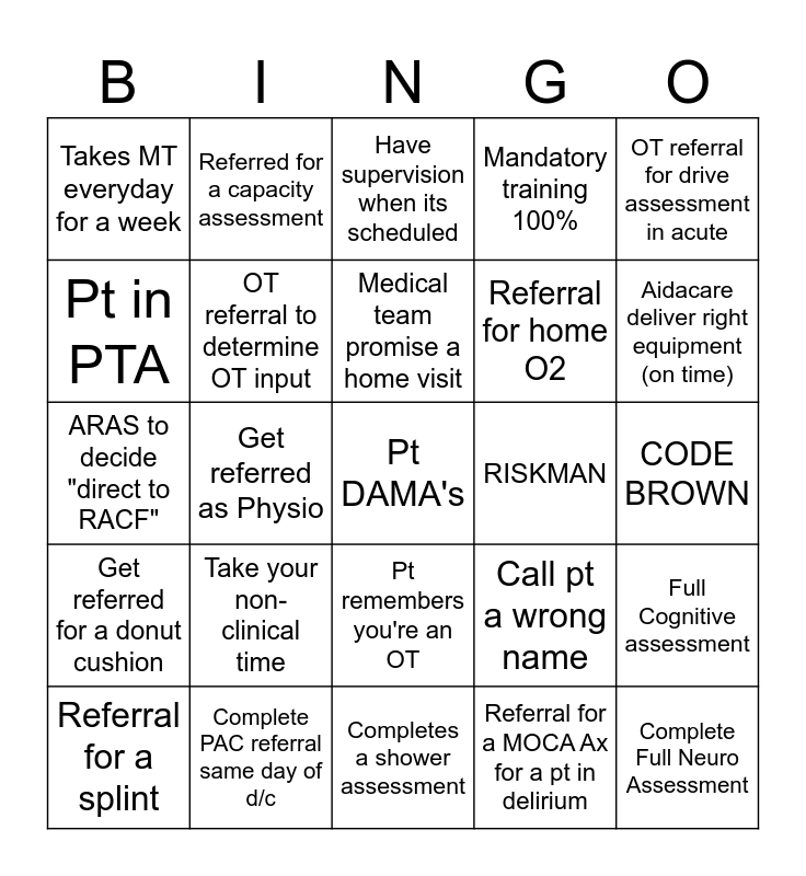 This bingo card has a free space and 24 words: Take your non-clinical time, Complete PAC referral same day of d/c, Medical team promise a home visit, Referral for a splint, OT referral for drive assessment in acute, Takes MT everyday for a week, Pt in PTA, Referred for a capacity assessment, RISKMAN, Pt remembers you're an OT, Referral for home O2, ARAS to decide "direct to RACF", Call pt a wrong name, Full Cognitive assessment, OT referral to determine OT input, Referral for a MOCA Ax for a pt in delirium, CODE BROWN, Have supervision when its scheduled, Aidacare deliver right equipment (on time), Get referred as Physio, Complete Full Neuro Assessment, Get referred for a donut cushion, Mandatory training 100% and Completes a shower assessment.