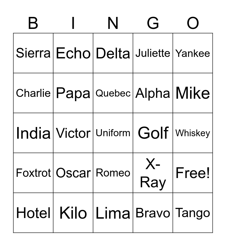 This bingo card has 28 words: Free!, Alpha Bravo Charlie Delta Echo Foxtrot Golf Hotel India Juliette Kilo Lima Mike November Oscar Papa Quebec Romeo Sierra Tango Uniform Victor Whiskey X-Ray Yankee Zulu, Alpha, Bravo, Charlie, Delta, Echo, Foxtrot, Golf, Hotel, India, Juliette, Kilo, Lima, Mike, November, Oscar, Papa, Quebec, Romeo, Sierra, Tango, Uniform, Victor, Whiskey, X-Ray, Yankee and Zulu.