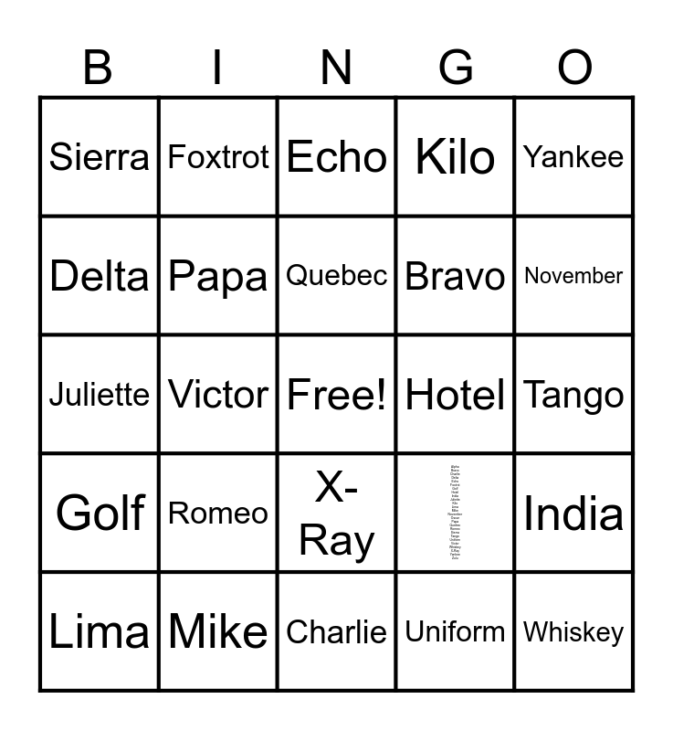 This bingo card has a free space and 27 words: Alpha Bravo Charlie Delta Echo Foxtrot Golf Hotel India Juliette Kilo Lima Mike November Oscar Papa Quebec Romeo Sierra Tango Uniform Victor Whiskey X-Ray Yankee Zulu, Alpha, Bravo, Charlie, Delta, Echo, Foxtrot, Golf, Hotel, India, Juliette, Kilo, Lima, Mike, November, Oscar, Papa, Quebec, Romeo, Sierra, Tango, Uniform, Victor, Whiskey, X-Ray, Yankee and Zulu.