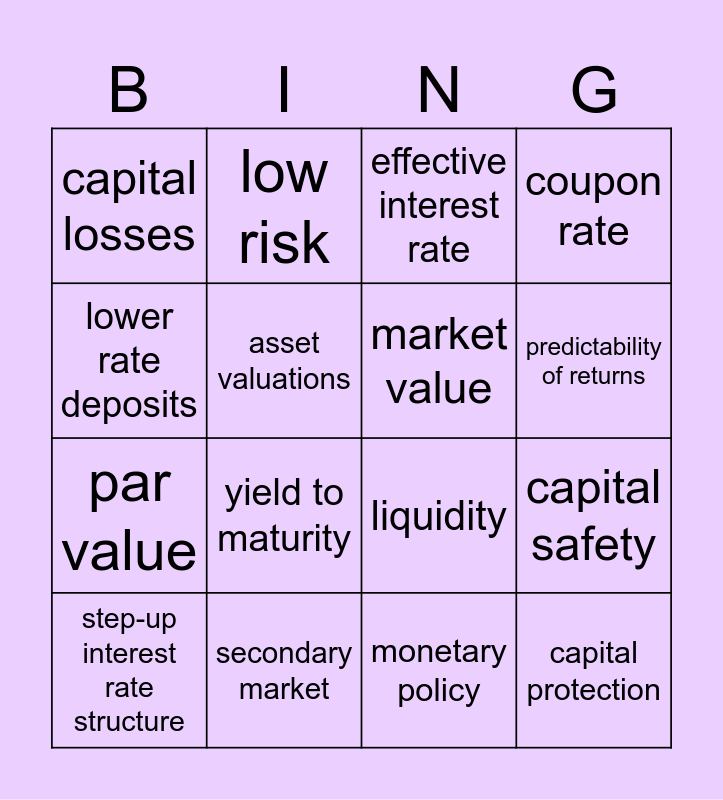 This bingo card has 16 words: secondary market, capital safety, effective interest rate, capital losses, par value, low risk, liquidity, monetary policy, lower rate deposits, asset valuations, step-up interest rate structure, coupon rate, yield to maturity, predictability of returns, market value and capital protection.